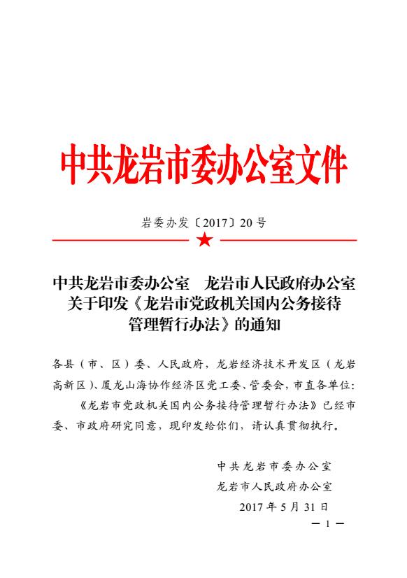 市委辦、市政府辦關于印發《龍巖市黨政機關國內公務接待管理暫行辦法》的通知(巖委辦發【2017】20號)