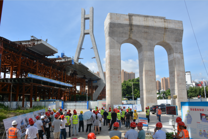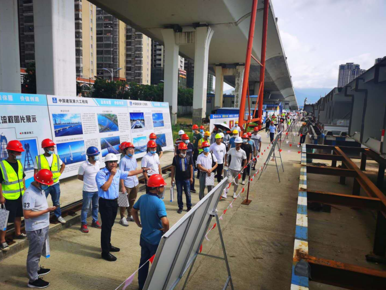 2020年6月28日,由龍巖城市發展集團有限公司主辦,龍巖市政建設集團有限公司(市城投公司)承辦,北京鐵研建設監理有限公司、中國建筑第六工程局有限公司、中冶(上海)鋼結構科技有限公司協辦的龍巖大道高架橋項目質量安全標準化觀摩會在龍巖大道高架橋主橋鋼箱梁工程現場舉行。觀摩會分拼裝區域、提升站區域、頂推滑移區域、步履滑移區域及主橋轉體區域分別展示了龍巖大橋主橋鋼結構拼裝、提升、弧形頂推滑移、步履滑移等新工藝及主塔“水平二次轉體”鋼箱梁頂推、斜拉索施工技術