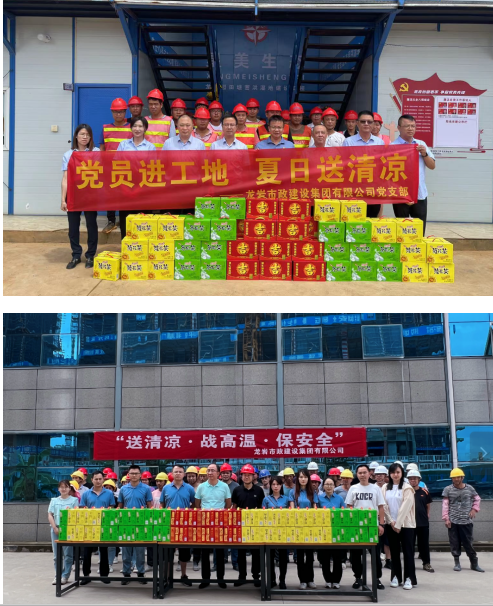 82122市政集團(tuán)黨支部書記董事長(zhǎng)總經(jīng)理孔華同志領(lǐng)公司領(lǐng)導(dǎo)班子成員及黨員志愿者小分隊(duì)分別前往園田塘蓄洪濕地工程浮蔡安置小區(qū)和龍欣安置小區(qū)等項(xiàng)目開展送清涼·戰(zhàn)高溫·保安全慰問活動(dòng)高溫天氣下仍?shī)^戰(zhàn)在一線的勞動(dòng)者們送去300件的防暑降溫物資
